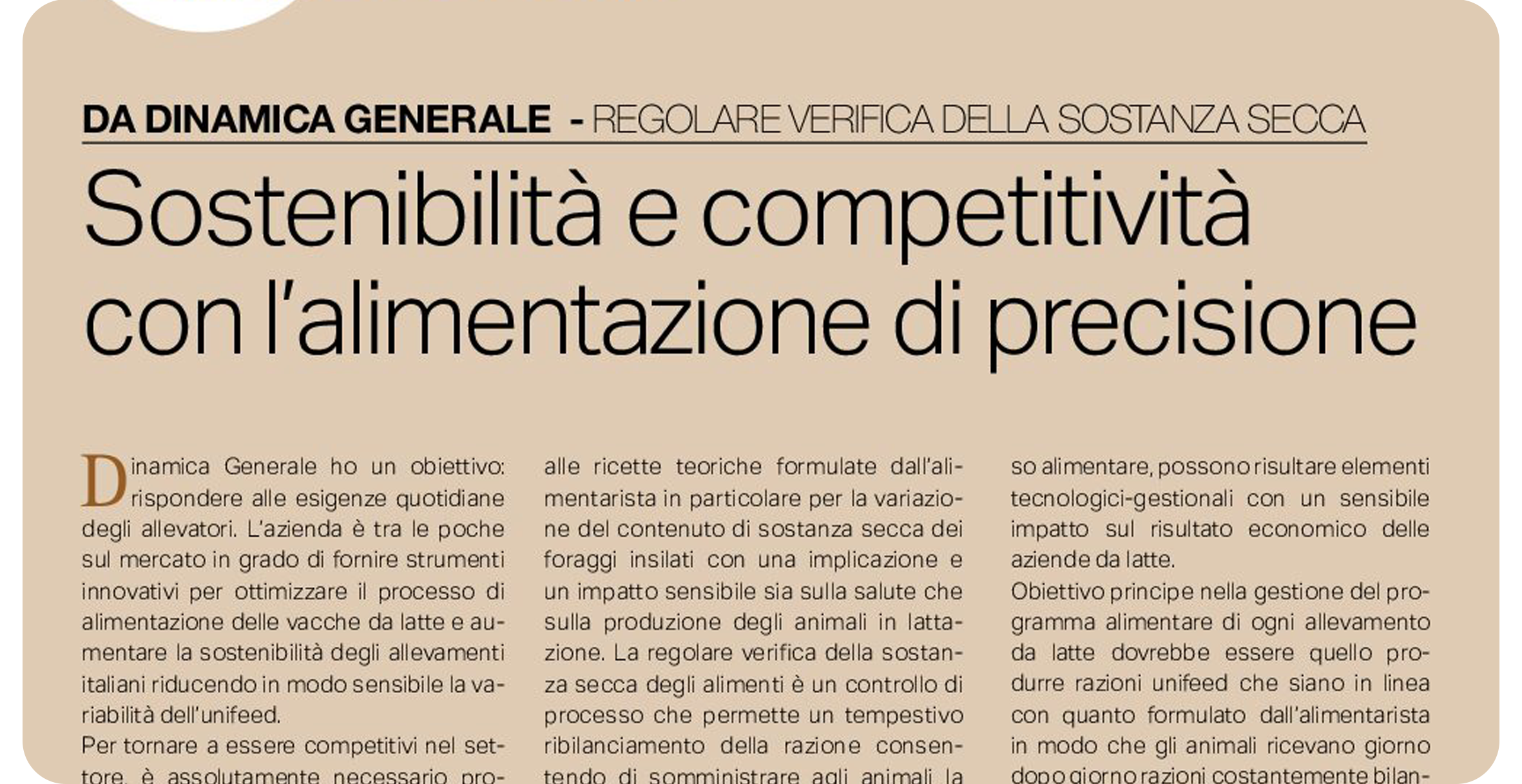 Dinamica Generale I hat ein Ziel: auf die täglichen Bedürfnisse der Milchviehhalter einzugehen. Das Unternehmen ist eines der wenigen auf dem Markt, das in der Lage ist, innovative Instrumente zur Optimierung der Fütterung von Milchkühen anzubieten und die Nachhaltigkeit italienischer Milchviehbetriebe zu erhöhen, indem es die Variabilität bei der Fütterung deutlich reduziert.