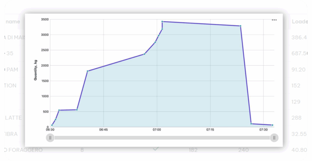 Ta wizualna oś czasu pokazuje fazy załadunku i rozładunku dla każdego wsadu, umożliwiając użytkownikom szybką weryfikację wykonania wsadu, monitorowanie czasu mieszania i potwierdzenie, że wszystkie etapy podawania były zgodne z zaplanowaną sekwencją.