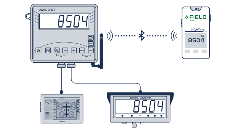 The FIELD scale App connects wirelessly to the DG400-BT, allowing operators to record and manage weighing data directly from the tractor cab using a tablet or smartphone.