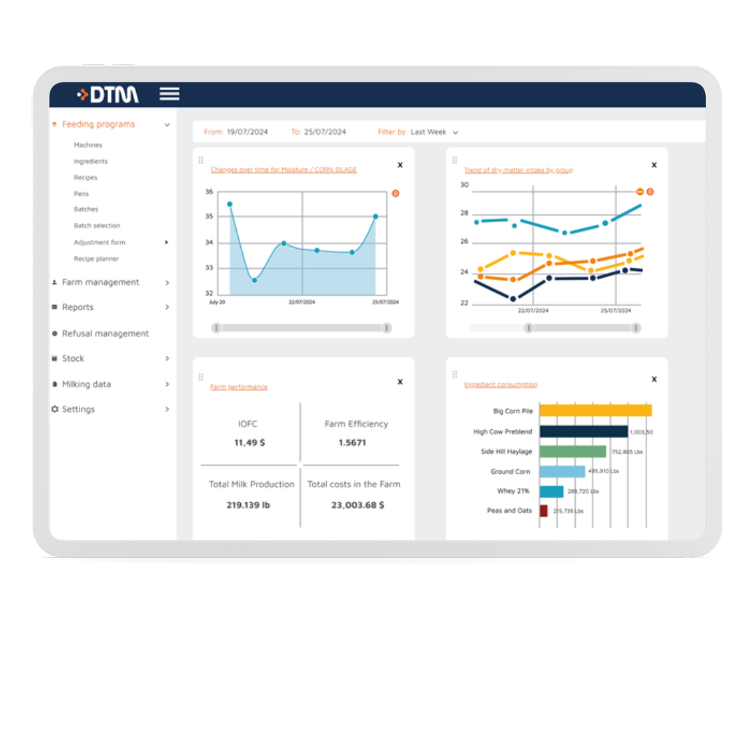 Integrate your herd-milking software to automatically import milk production and cow data with ease. DTM is compatible with all major brands, ensuring a smooth connection. Gain access to live reports on feed efficiency and Income Over Feed Cost (IOFC).