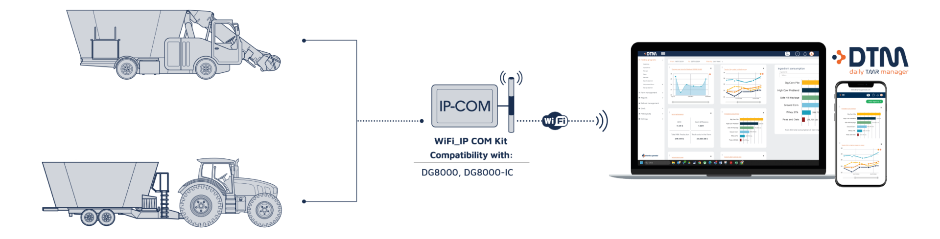 Transfer feeding plans and executions from DG8000 to DTM and viceversa wirelessly even without a mobile network, thanks to WiFi connection. IP-COM enables farmers to exchange data between the scale and the software within an impressive range of 800 meters.